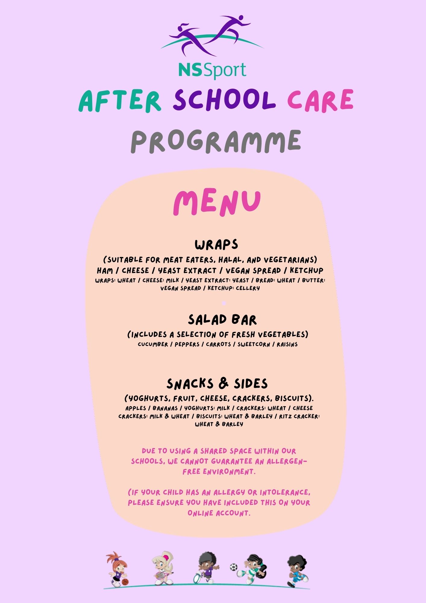 We have After School Care programmes running at the following schools so please review the links below to find out further information. Please note the Full & Late sessions include a "lite bite" meal and snack after school. Our team follow a set menu. Please include all dietary & allergy/medical notes clearly on your NSSport account. This is especially important if your child has been coming to our service and a new dietary requirement has been identified.
